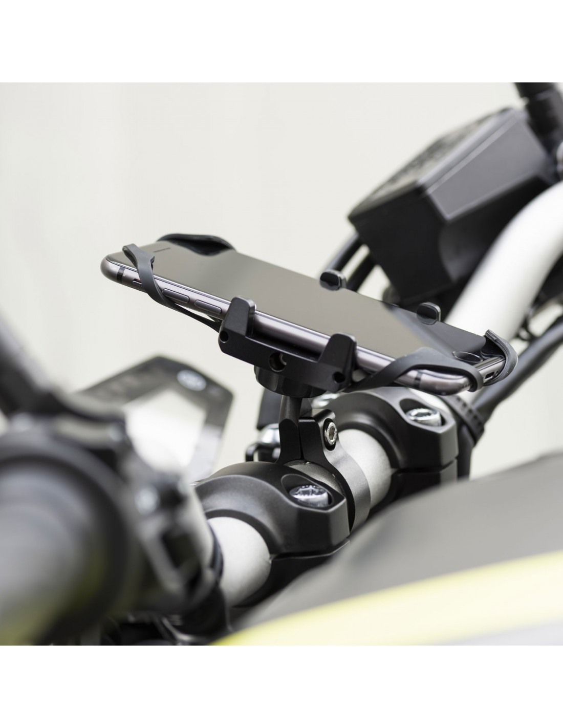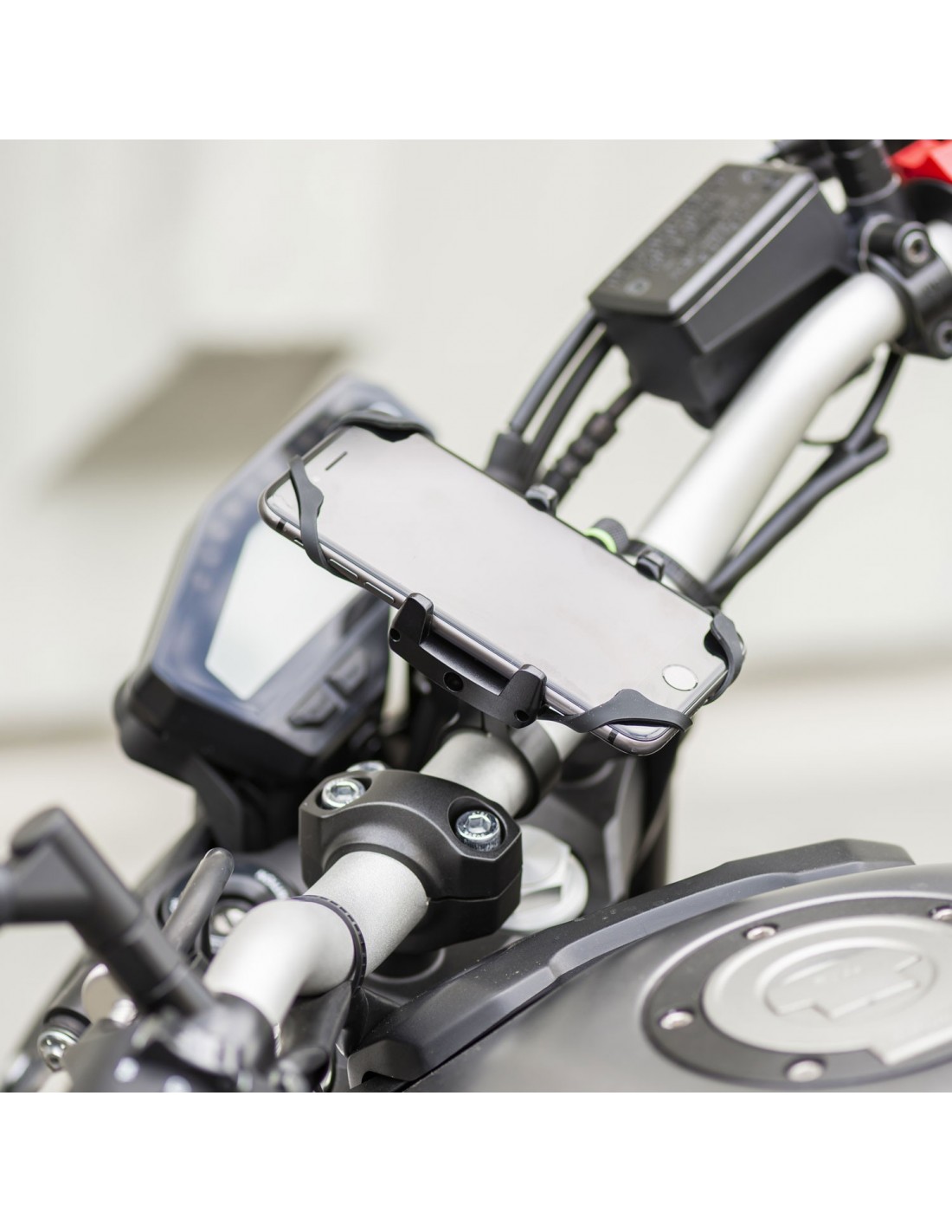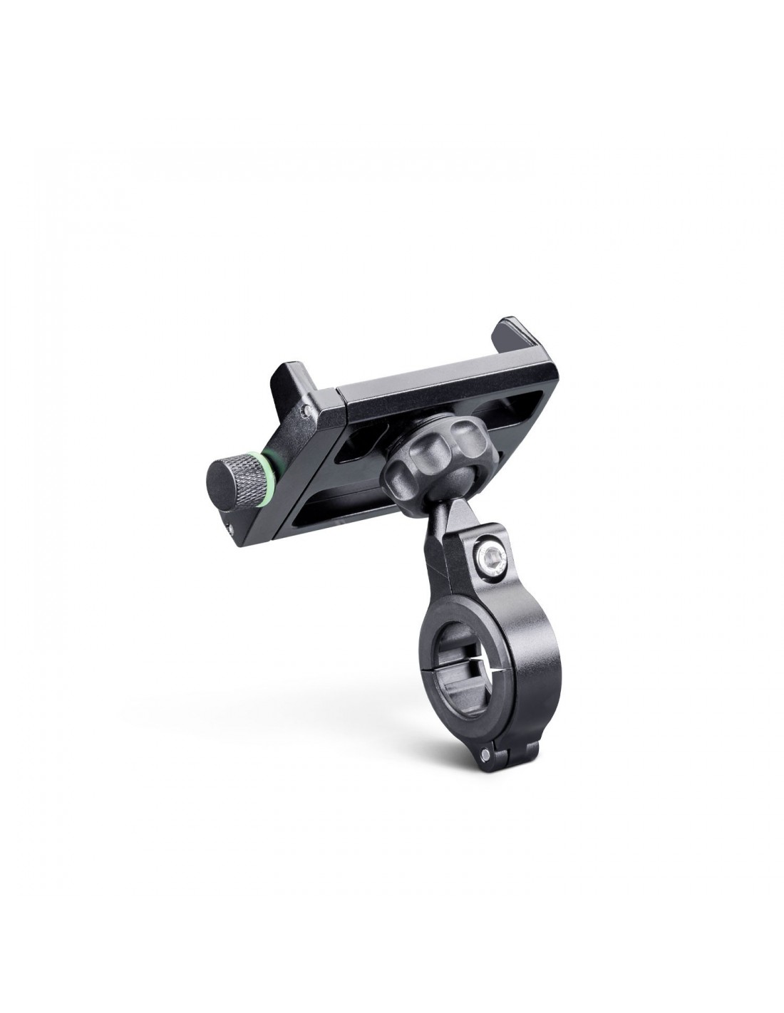 Soporte de smartphone de aluminio para manillares de 22 a 32mm. Para carcasas hasta 6,2", incluye rejilla de seguridad.