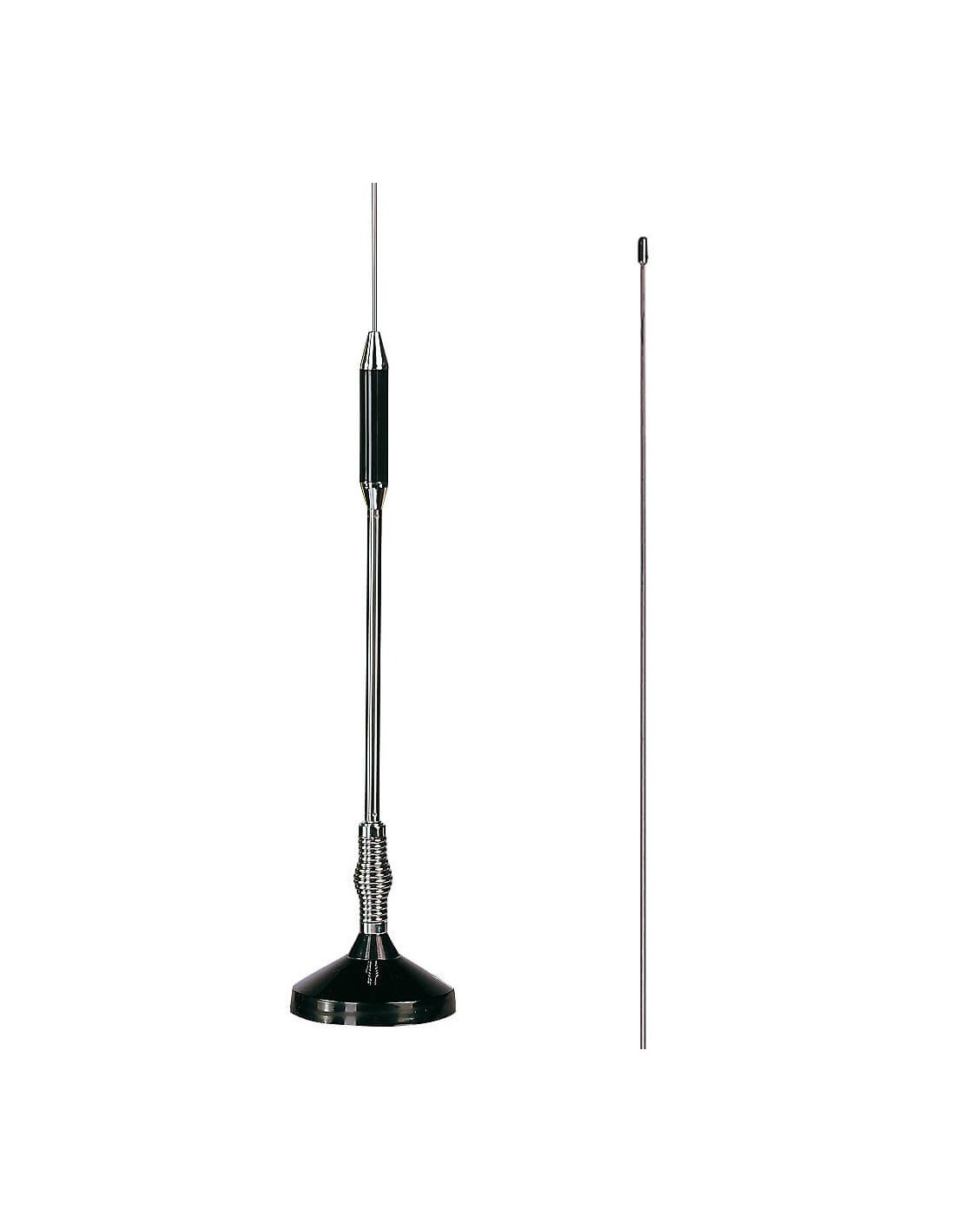Antena móvil CB con base magnética, bobina central y muelle de choque cromado. De diseño compacto con cable y conector PL. Ideal para montar como antena CB para camiones y coches.