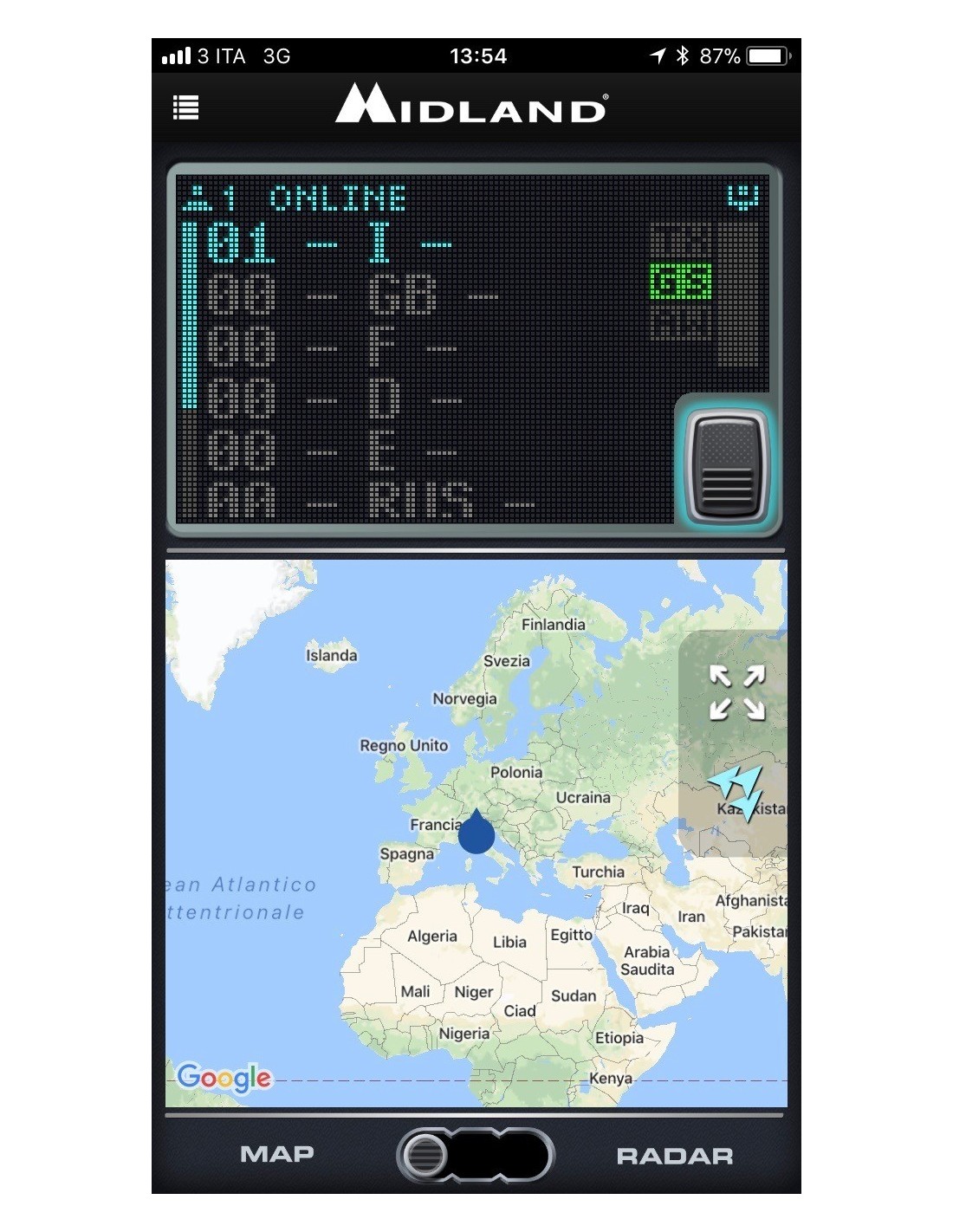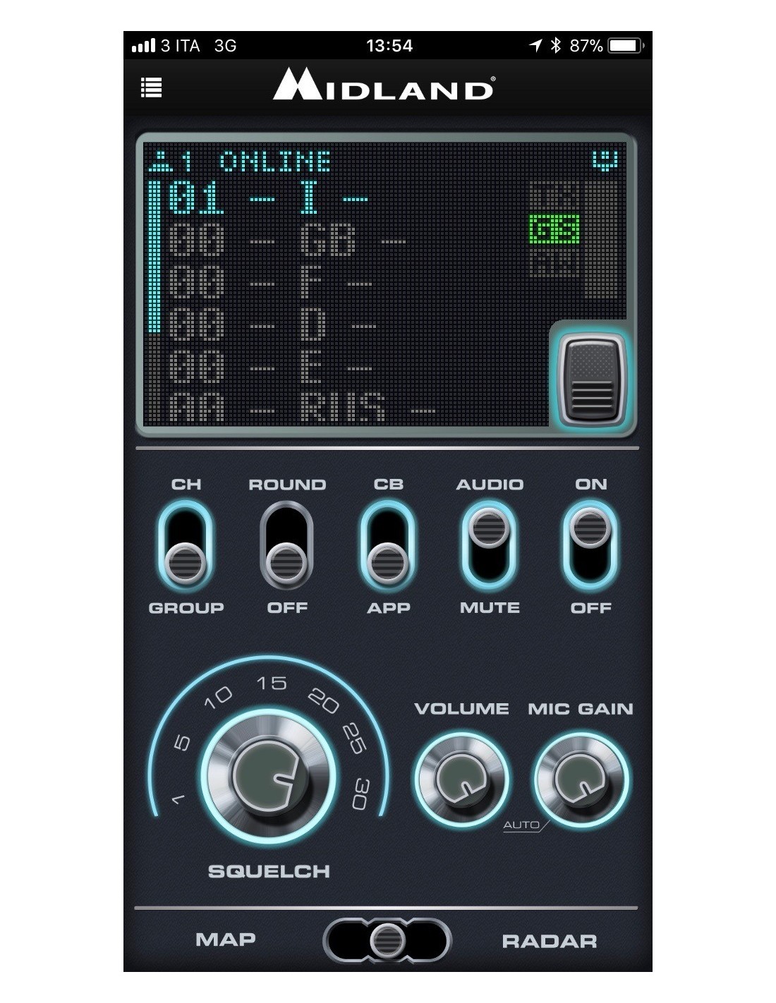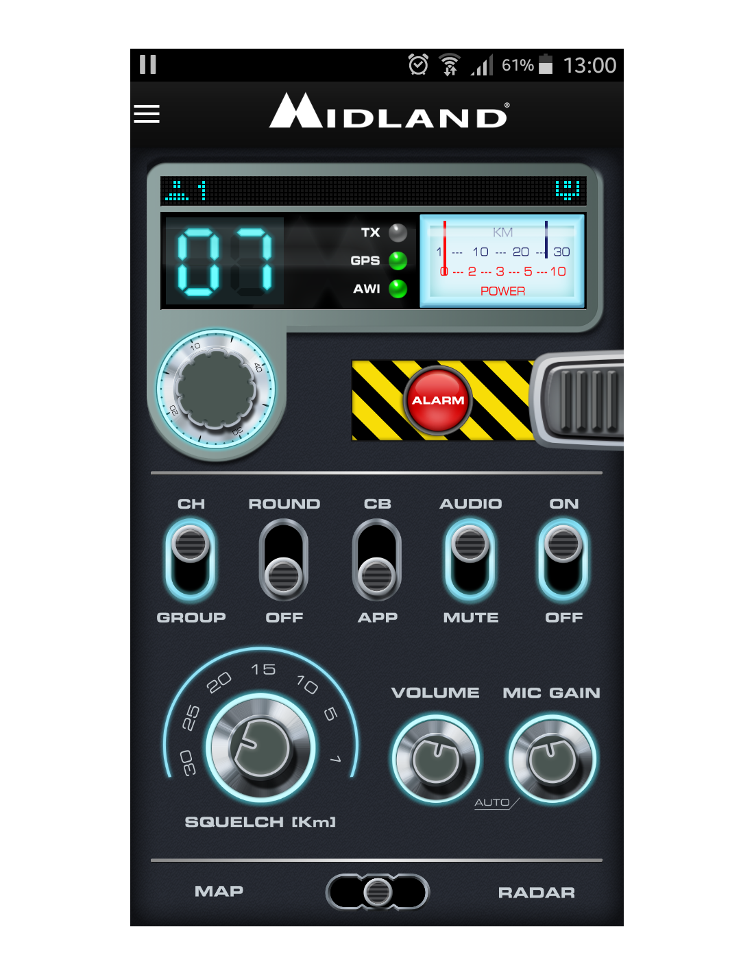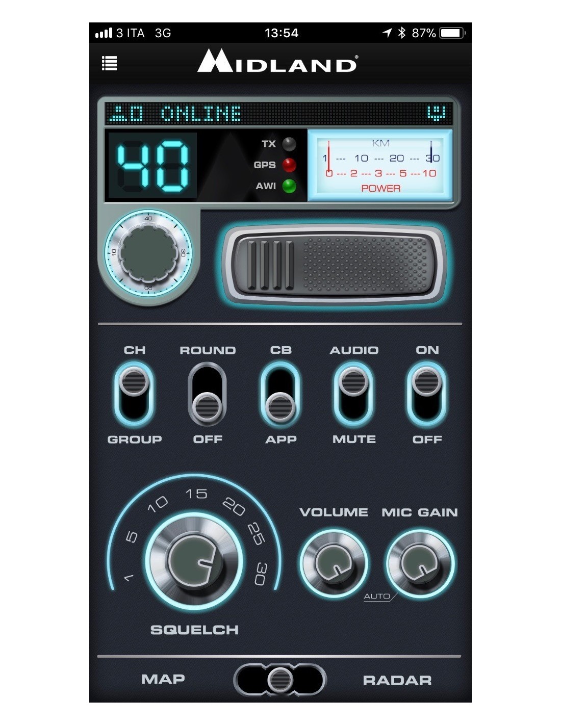 La interfaz de la aplicación emula la radio CB Midland ALAN 48, resulta muy amigable y cuenta con funciones avanzadas.