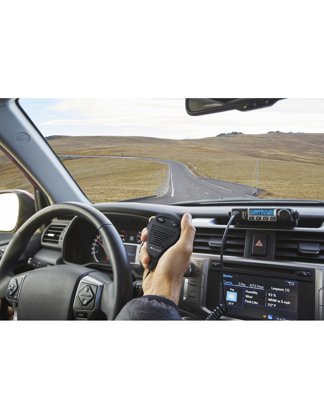 Completan el frontal de la CB: el micrófono extraíble con conector RJ45, la pantalla LCD con S-Meter, el atenuador ajustable (ganancia de RF).