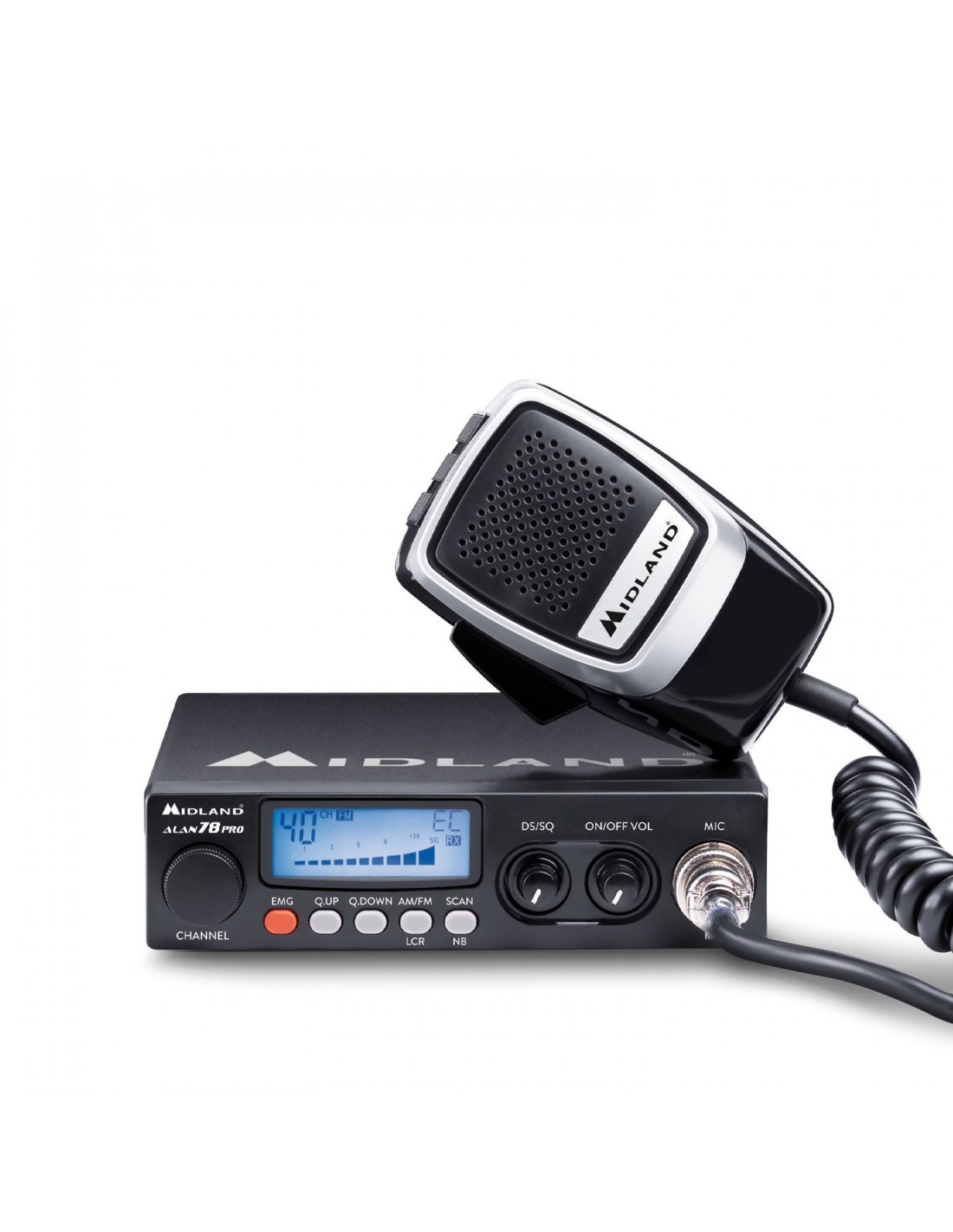 Con Alan 78 Pro es posible escanear los canales disponibles (función SCAN), está equipada con un botón EMG para la recuperación inmediata del canal de emergencia 9 y una pantalla multifunción con retroiluminación azul. Se completa con la indicación en la pantalla del S-Meter para indicar la fuerza de la señal transmitida y recibida, altavoz externo y un conector de micrófono de 6 pines. El micrófono suministrado es "Precision Series", con botones Arriba, Abajo y Bloqueo.