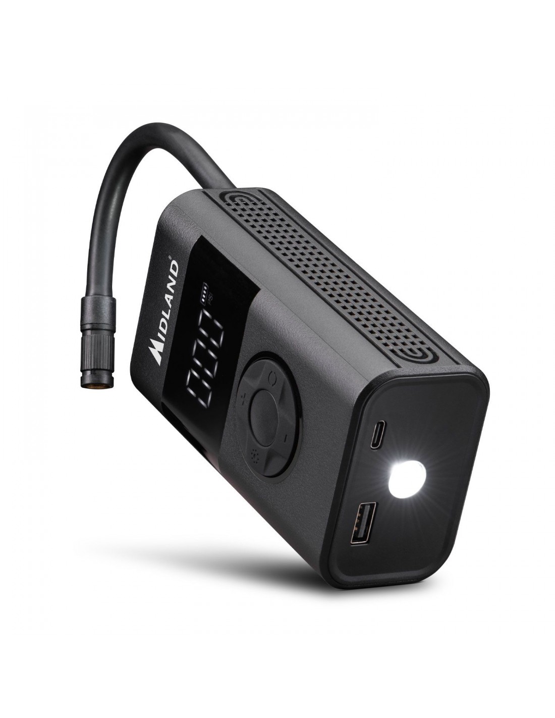Para uso nocturno, el compresor está equipado con una linterna LED. Esta característica es extremadamente útil para situaciones de emergencia en condiciones de poca luz, como durante la noche o en áreas oscuras.