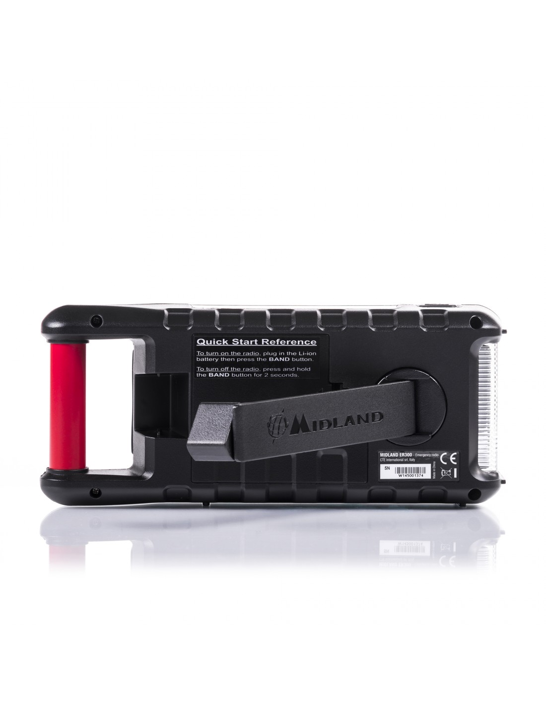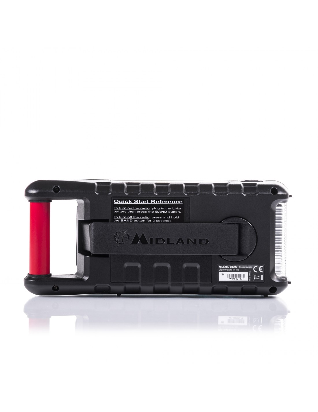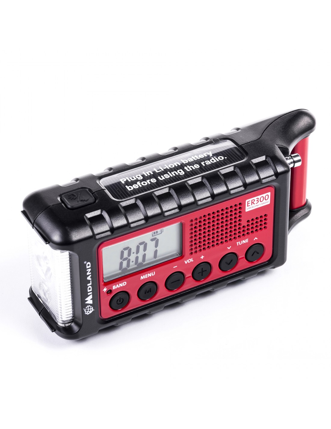 xMidland ER300 es un dispositivo de emergencia equipado con un receptor AM / FM, diseñado principalmente para situaciones de emergencia, calamidad y seguridad donde mantenerse en contacto es esencial. Pero no solo eso, también es una excelente solución para el uso diario, para todas las actividades al aire libre, camping o en el tiempo libre, y es fácil de llevar contigo gracias a su práctica asa. ER300 tiene la particularidad de poder cargarse de 3 formas diferentes: mediante dínamo ubicada en la parte posterior del producto, que permite la recarga manual en ausencia de dispositivos de recarga, con un panel solar que recarga la batería interna Li-Ion 2200mAh, o simplemente con pilas recargables.
