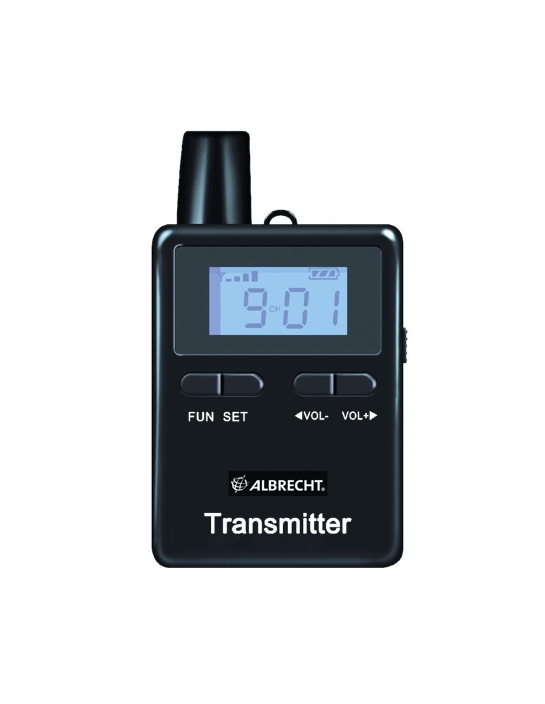 - 1 Transmisor ATT400 con microauricular para guía, batería recargable, clip para cinturón y correa para el cuello