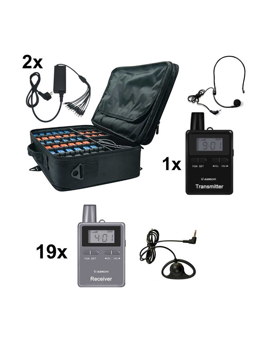 • 1 Transmisor ATT400 con microauricular para el guía, batería recargable, clip para cinturón y correa de transporte.