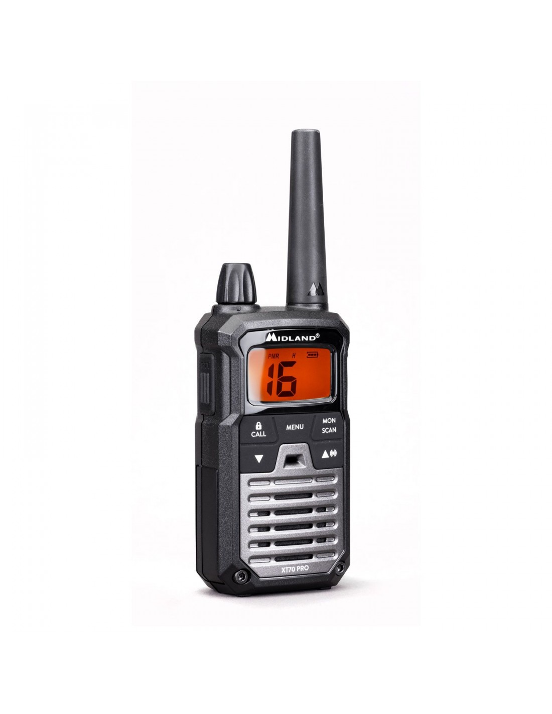 XT70 PRO mantiene el color gris/gunmetal (versión blister) para dar continuidad, mientras que en la versión H&W utiliza el color naranja (para ser inmediatamente identificable en caso de necesidad), pero definitivamente amplía su rendimiento con una banda de frecuencia extendida (PMR446: 446.00625 - 446.19375MHz), una resistencia al agua IPX4 y el squelch ajustable a varios niveles.