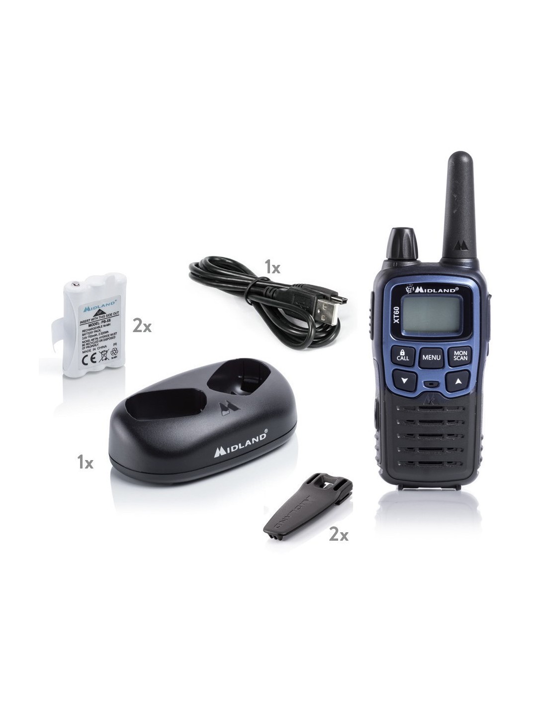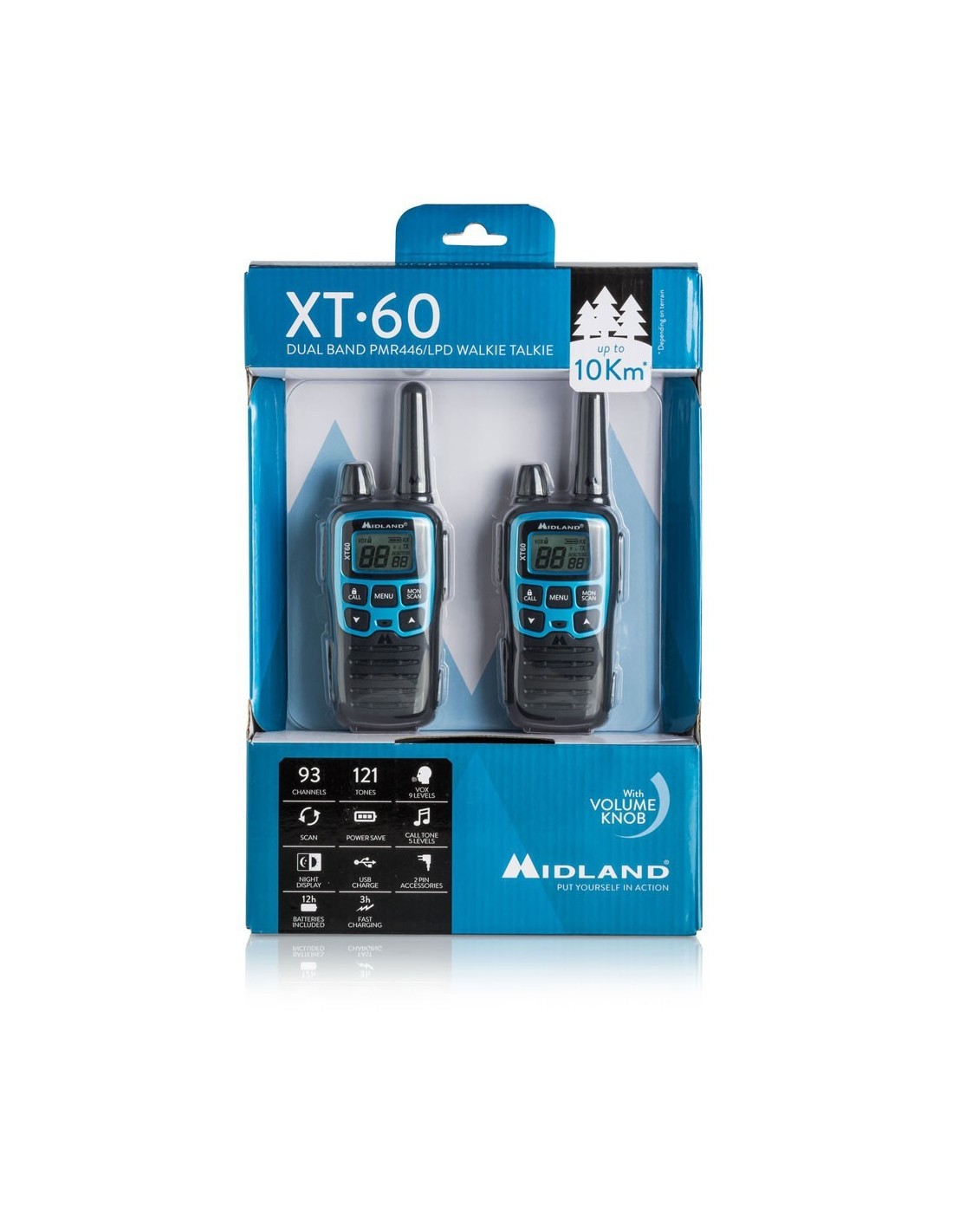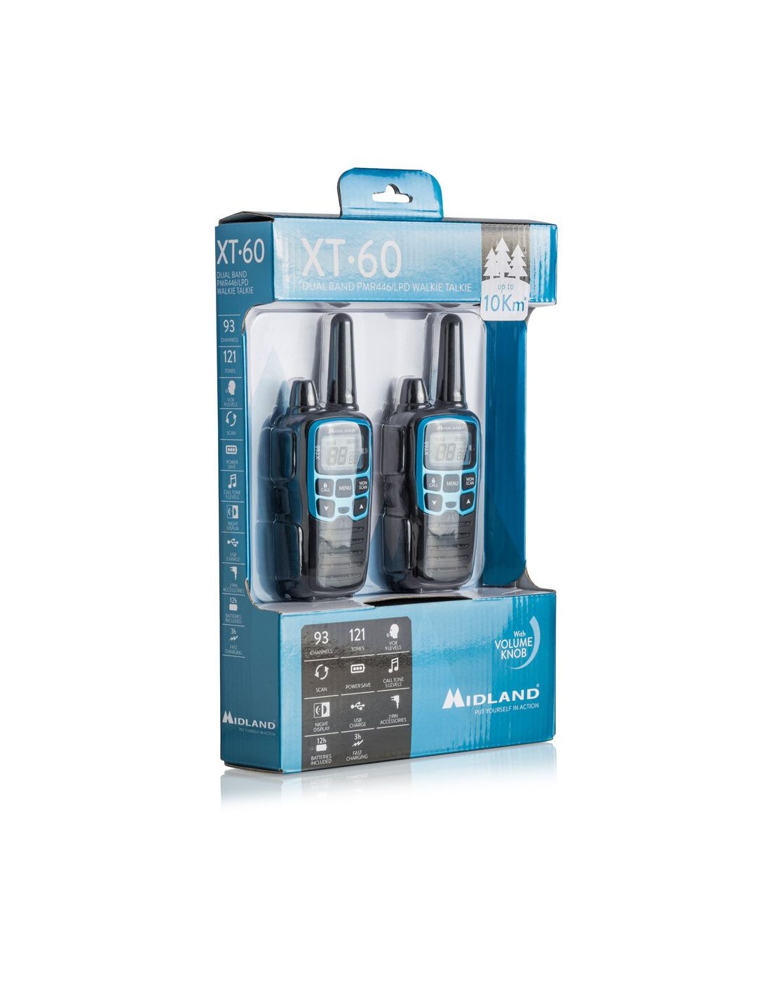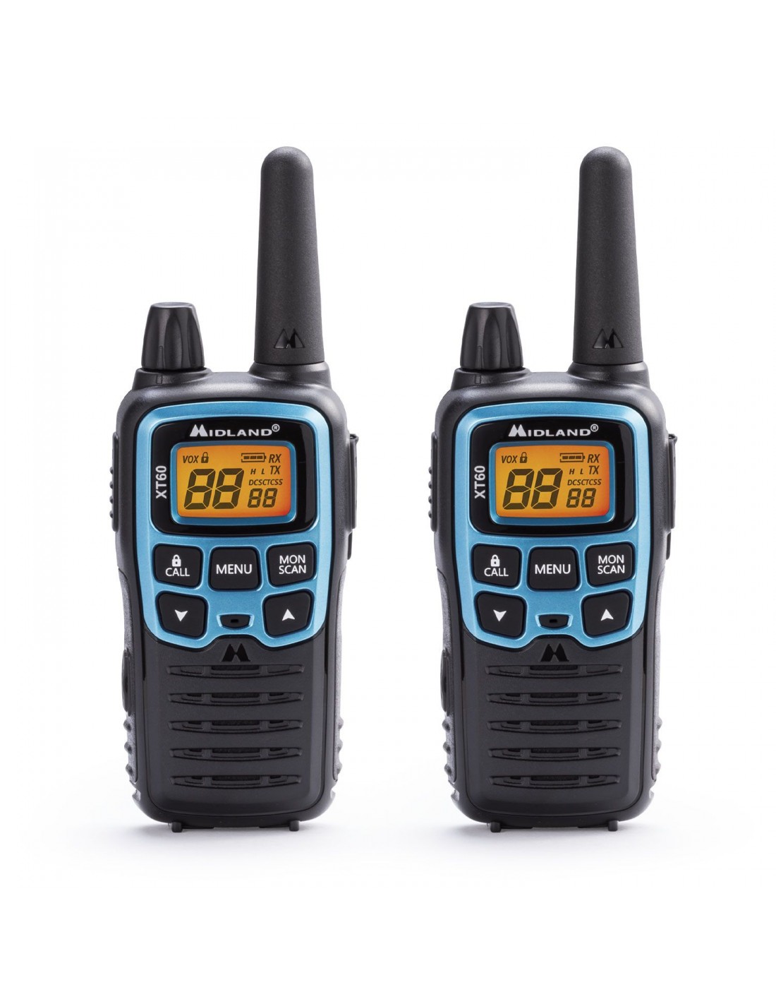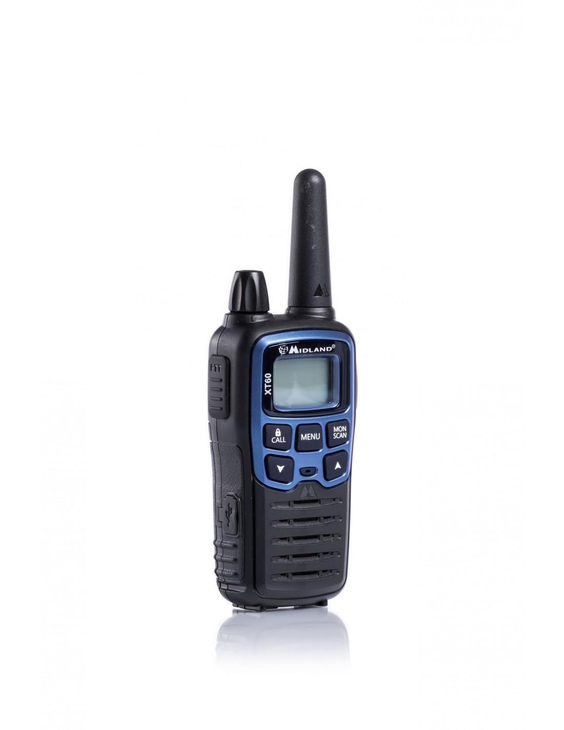 La libertad de las frecuencias LPD y la potencia del PMR446 en el azul eléctrico del Midland XT60, un práctico sistema de comunicación, fácil de usar pero al mismo tiempo con un rendimiento superior a los estándares de los walkie-talkies aficionados normales.