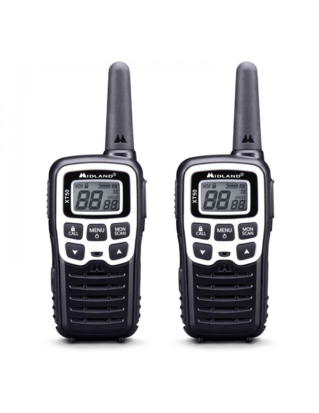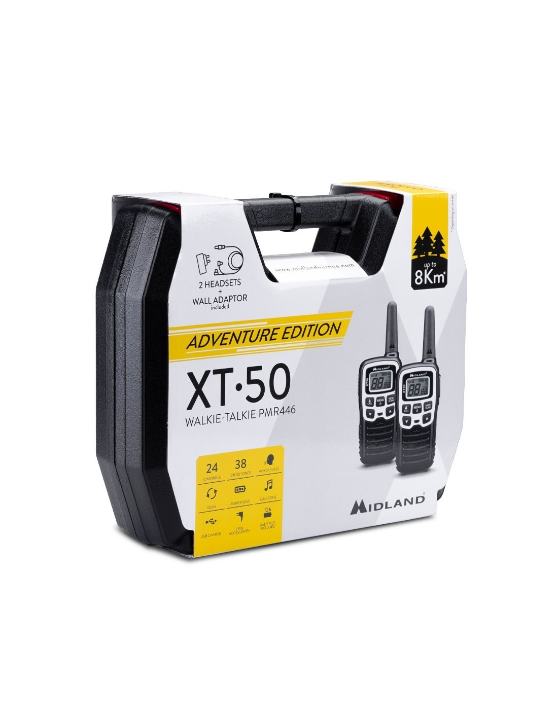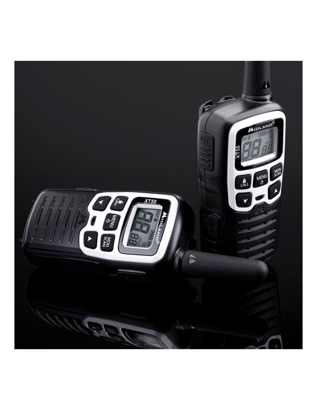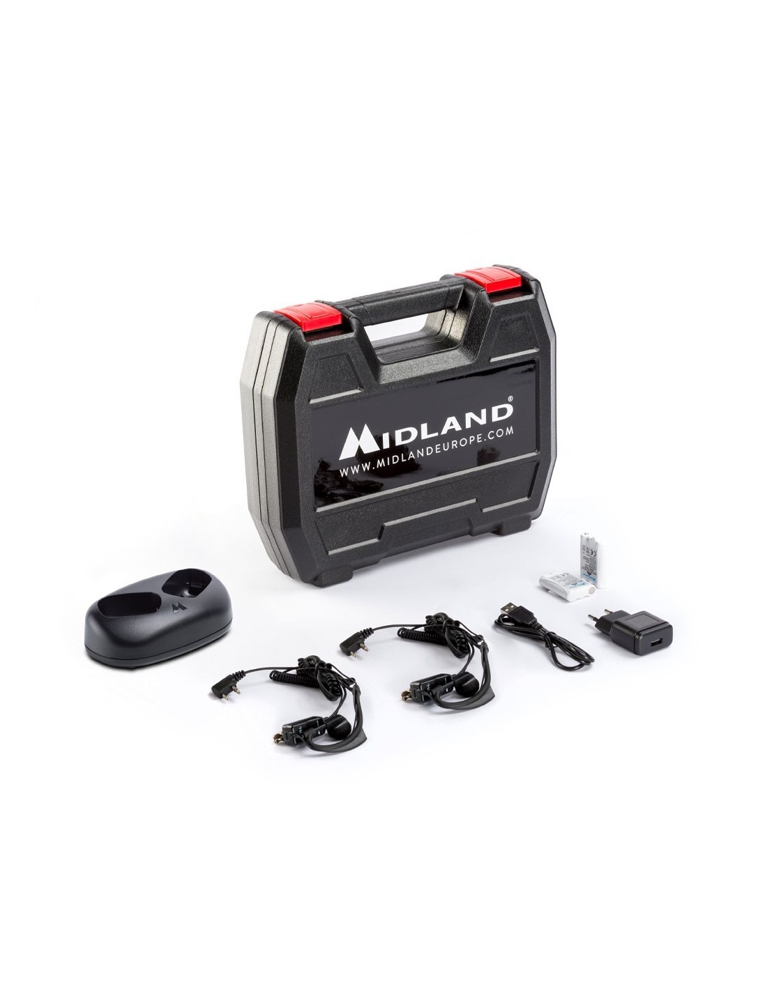 Walkie-talkies PMR446 con un alcance de unos 8 Km y 14 horas de autonomía, en un compacto maletín de transporte que incluye microauriculares MA21-Li y un cargador doble de sobremesa.