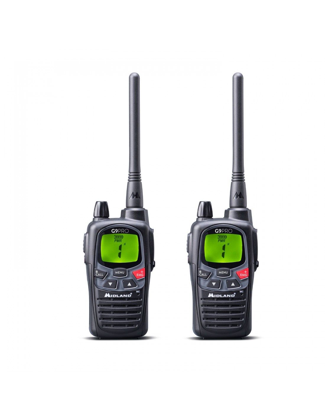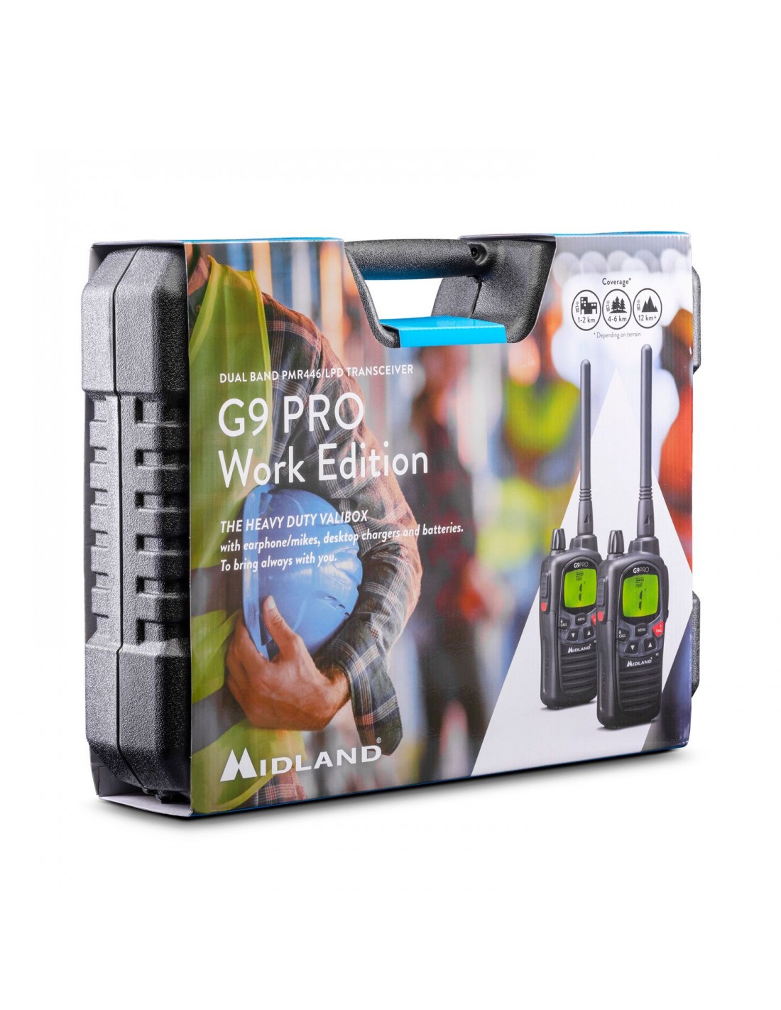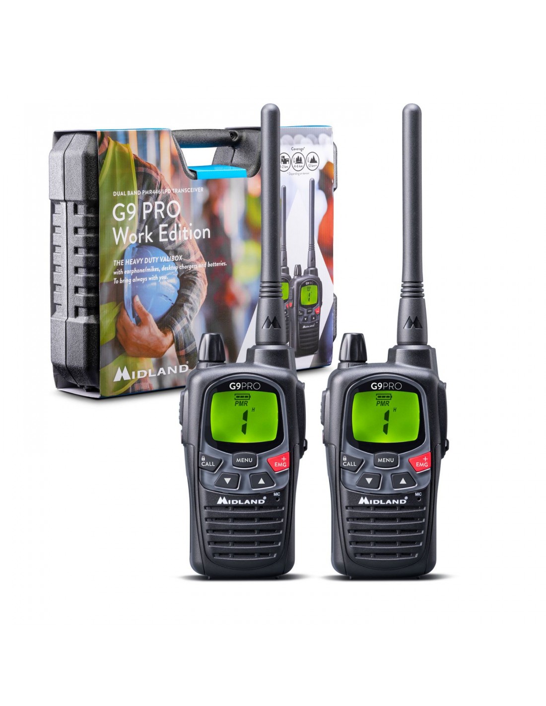 2 G9 PRO negros, el best seller por excelencia de Midland, con microauriculares y accesorios en un maletín de transporte indestructible, pensado para los ambientes más difíciles.