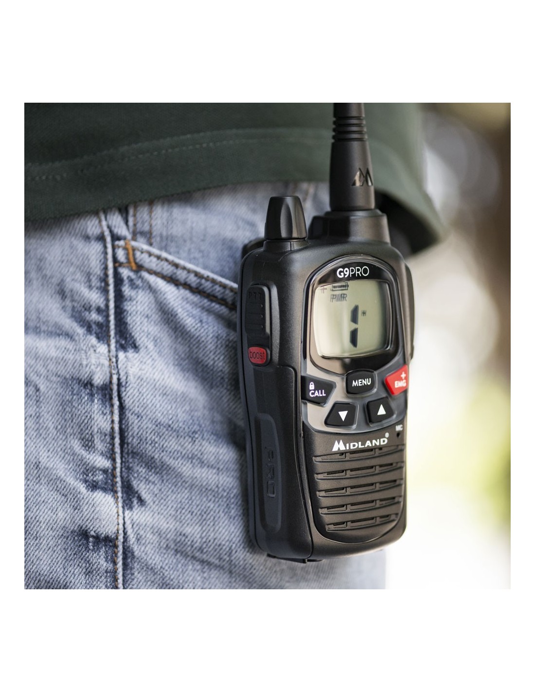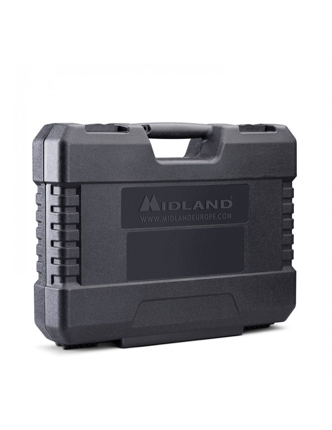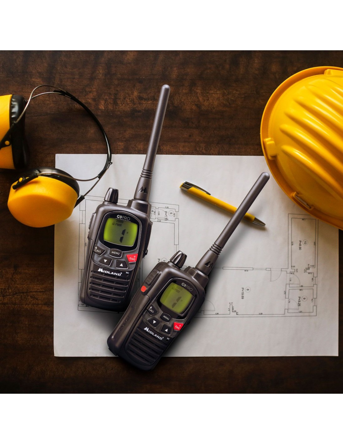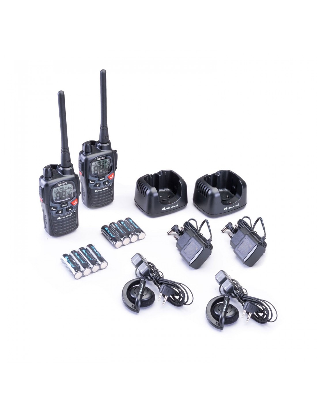 2 G9 PRO negros, el best seller por excelencia de Midland, con microauriculares y accesorios en un maletín de transporte indestructible, pensado para los ambientes más difíciles.